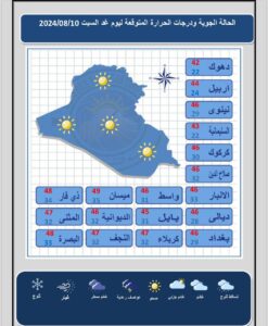 شاركها فيسبوك تويتر لينكدإن بينتيريست البريد الإلكتروني أعلنت هيئة الأنواء الجوية، اليوم الجمعة، عن حالة الطقس في مدن البلاد خلال الأيام المقبلة، فيما أشارت إلى أن الأجواء تشهد استقرارا بدرجات الحرارة مصحوبة بغبار خفيف. almasra