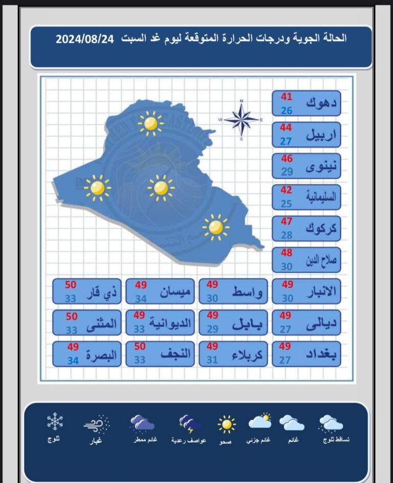 أنت الآن تتصفح:الرئيسية»العراق»الطقس: الحرارة في 10 محافظات تلامس نصف درجة الغليان (جداول)