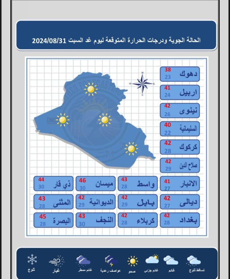 شاركها فيسبوك تويتر لينكدإن بينتيريست البريد الإلكتروني أعلنت هيئة الانواء الجوية، اليوم الجمعة، عن حالة الطقس في العراق خلال الأيام المقبلة، فيما توقعت أجواء صحوة مع بعض قطع الغيوم وهبوب للرياح متوسطة السرعة في المنطقتين الوسطى والجنوبية واستمرار الانخفاض بدرجات الحرارة.