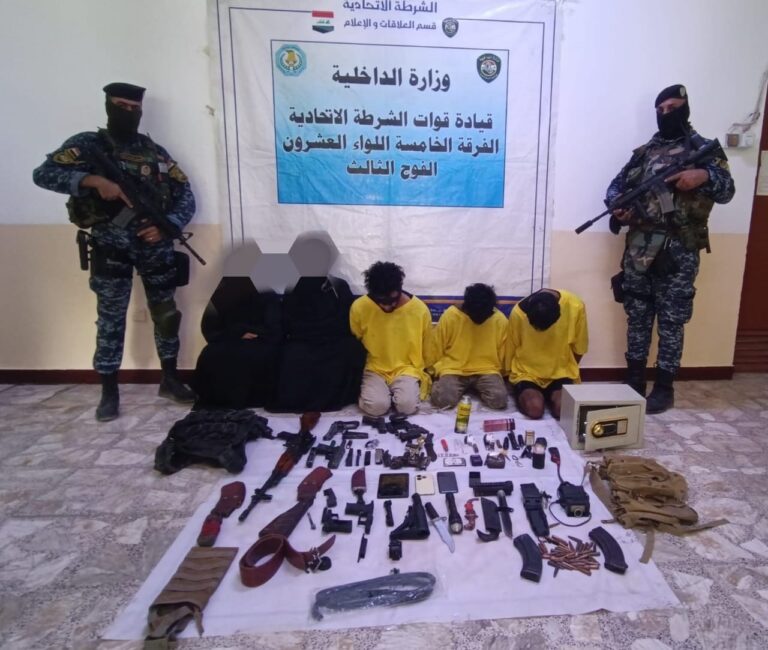 وقالت القيادة في بيان تابعه المسرى ،إنه”استكمالاً للخطة الأمنية المعدة لتعزيز الأمن والاستقرار في العاصمة بغداد، شرعت قوة من الفرقة الخامسة شرطة اتحادية بإشراف ميداني من قبل اللواء قائد الفرقة وبإسناد استخباري عالي المستوى بتنفيذ عملية أمنية استباقية، أسفرت عن إلقاء القبض على عصابة مكونة من خمسة متهمين بينهم “امرأتان” متخصصة بجرائم التسليب والمتاجرة بالمخدرات والدكات العشائرية”.