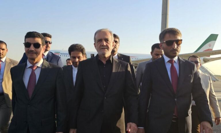 شاركها فيسبوك تويتر لينكدإن بينتيريست البريد الإلكتروني وصل الرئيس الإيراني، مسعود بزشكيان، اليوم الخميس، الى محافظة النجف قادماً من مطار السليمانية. وكان الرئيس الإيراني قد زار اليوم أربيل والسليمانية في ثاني أيام زيارته الى العراق،